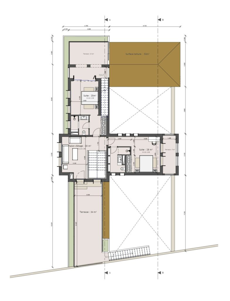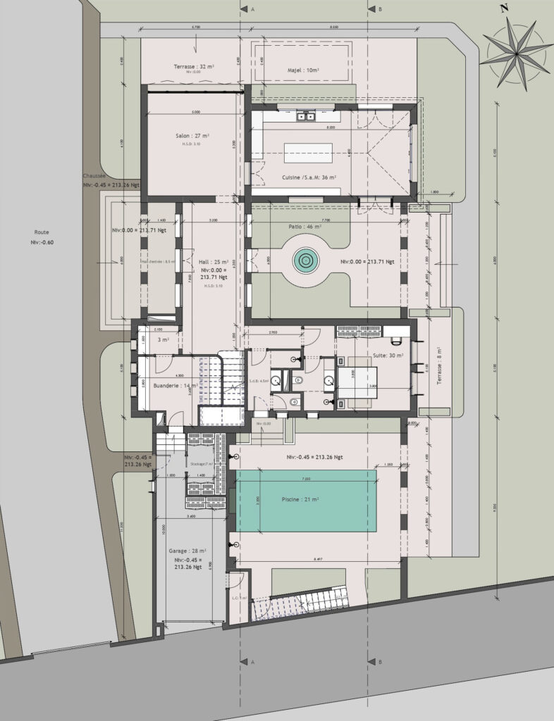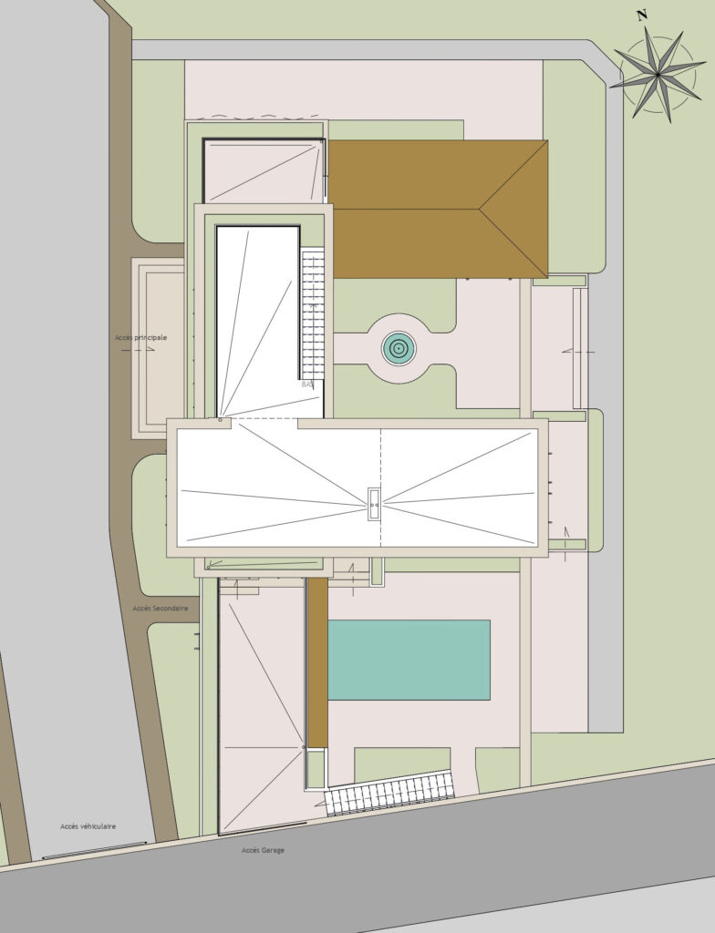 L’organisation générale s’articule ainsi autour de deux patios, véritables pôles de respiration autour desquels se déploient les différentes fonctions de la maison. Ils permettent une circulation fluide et une distribution claire des espaces, renforçant le lien entre intérieur et extérieur.